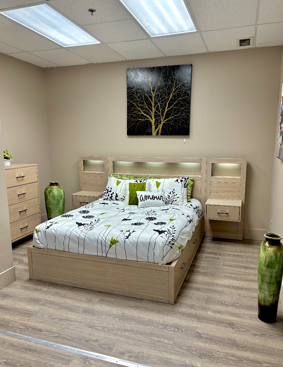 Belmont Queen Size HB, Ground Level Side Storage Bed with 2 Drawers on each side and Floating Nightstand on each side.Displayed in Ivory Stain.Material: Solid Pine Wood.Width: 107″Height: 49″Depth: 85″Read More