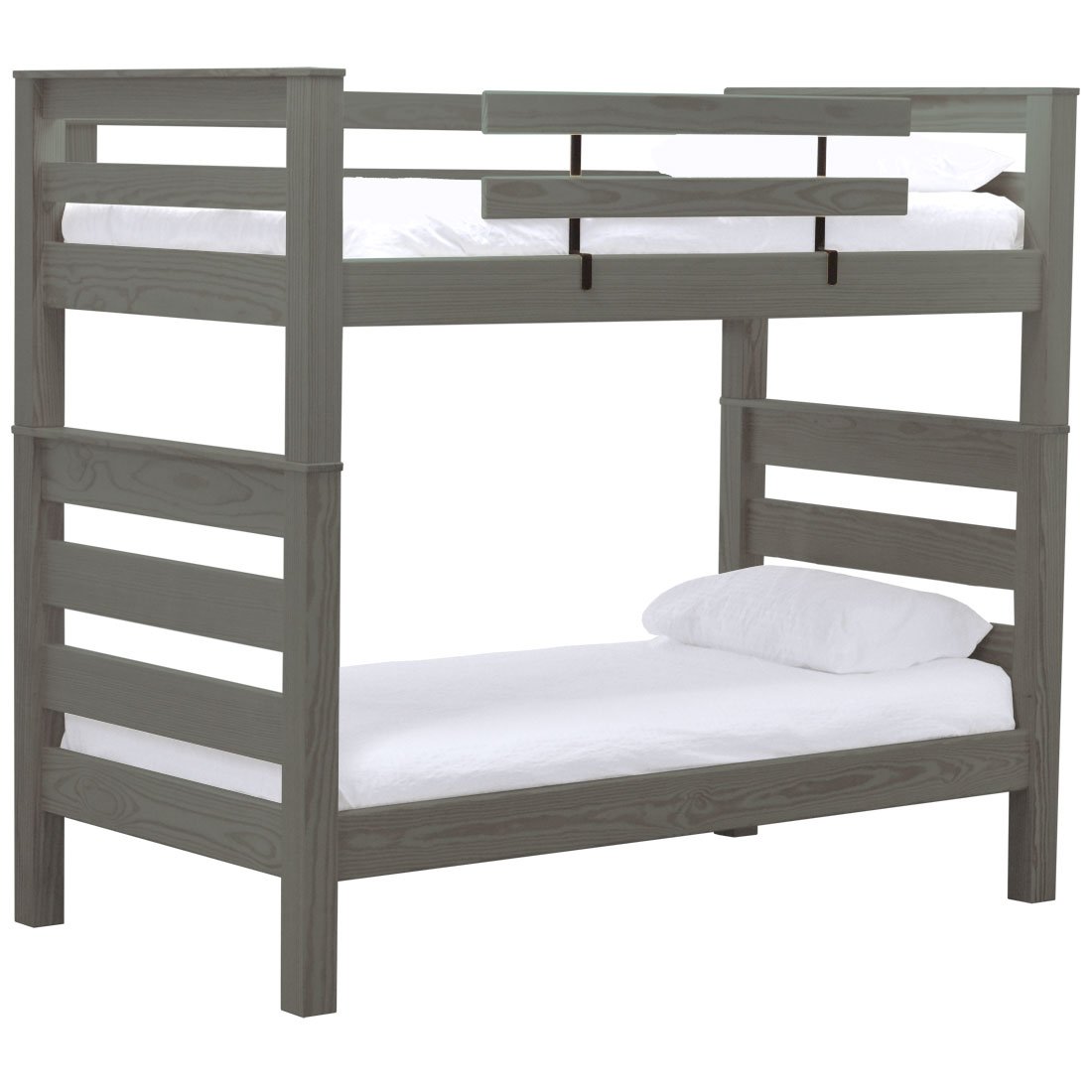 TimberFrame bunk beds feature massive corner posts with thick ladder rungs in between using mortise and tenon construction. A removable guardrail is included on the front with a full-length guardrail at the rear of the upper bed. Add optional drawers or a trundle bed for maximum use of your floor space. Ready for a mattress, no foundation required. The top of an 8” thick mattress on the lower bed will be 21” and on the upper bed will be 64” off the floor. All bunk beds and beds have been tested to accommodate over 450 pounds and are recommended for adult use.