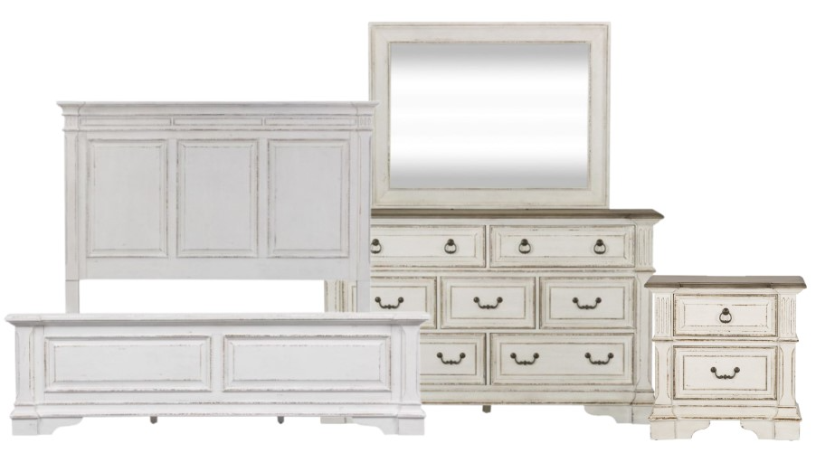 Design possibilities are endless with the Abbey Park king panel bed, dresser, mirror, and nightstand. Crafted of poplar solids and cathedral white oak veneers, this kit features an antique white finish with heavy chipping and weathered brown whitewash tops, full extension drawers.Read More