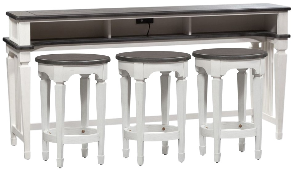 Features heavy wire brushing, planked top, three storage cubbies, two electrical outlets and two USB ports for easy access charging, anchored with square tapered legs and a slat style end panel. This classic console bar table and stools would make a gorgeous addition to your casual styled home, perfect for behind your sofa or kitchen nook. Kit consist of one console bar table and three console stools. Also available in a black forest and emery grey top.