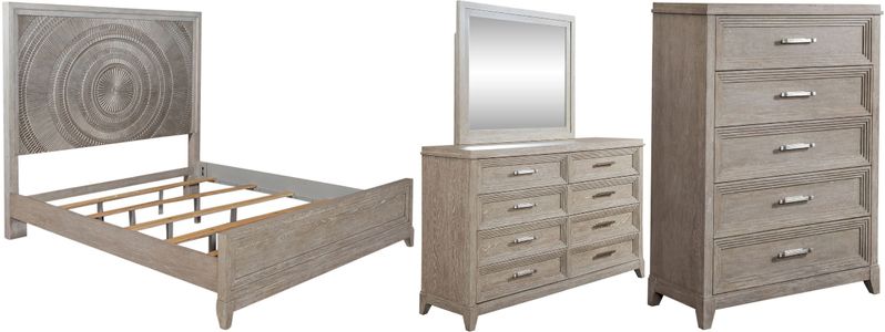 Elevate your luxurious home with the Belmar king panel bed, dresser, mirror, and chest. Crafted of rubberwood solids and split heart oak veneers, this kit features a washed taupe and silver champagne finish, full extension drawers with premium felt lined top drawers and cedar lined bottom drawers.Read More