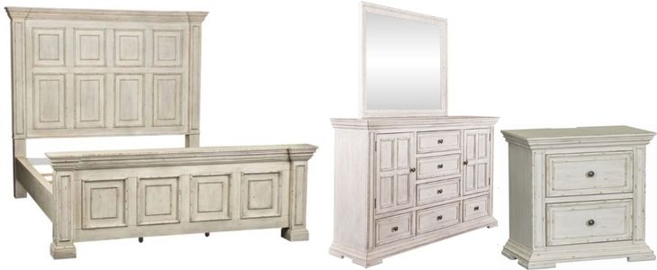 Live life beautifully with the Big Valley king panel bed, dresser, mirror, and nightstand. Crafted of rubberwood solids with wood products, this kit features a whitestone finish with heavy distressing, wood framed doors and drawers, graduated bead molding creating architectural interest, square pilasters and block feet.Read More