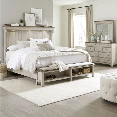 Set includes: King Mantle Storage Bed,Upholstered Bench, Dresser and Mirror
