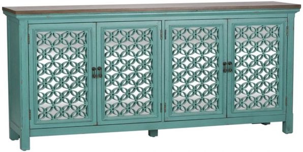 Transform your home with the Kensington 72" accent cabinet. Crafted of Eucalyptus solids and Ash veneers in a wire brushed Turquoise finish and Spice wood tone top. Features four mirrored doors with decorative floral pattern overlays, block feet and one concealed fixed shelf behind doors.Read More