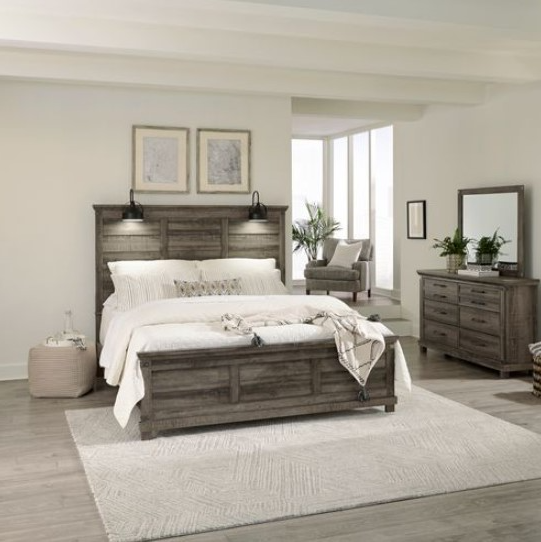 The two beautiful sconce LED lights on the headboard can be used for task, ambient, or accent lighting. Use the panel bed rails featuring hook-on support to complete the bed. The dresser has hammered metal corner accent plates along with wood-framed drawer fronts and Antique Pewter bar pull hardware for visual appeal. The top two drawers feature bluff-cut drawer fronts giving the illusion of multiple smaller drawers while still offering deep storage. Clean lines and block feet round out the rustic, cottage look. Attach the landscape mirror to the dresser with the included bolt-on supports. The mirror offers a unique point of view with hammered metal corner accent plates and a beveled edge for a sparkling visual appeal. The urban living design and the rustic charm or cottage appeal of the Lakeside Haven king panel bed, dresser, and mirror offer style, substance, and handcrafted character.