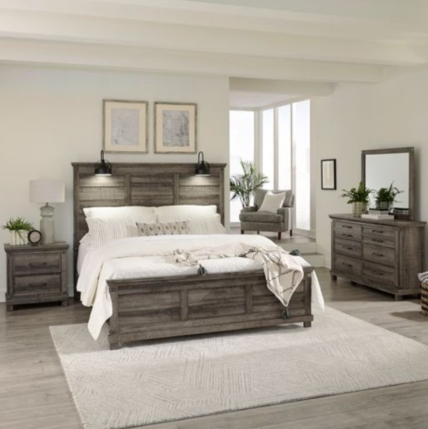 Hit the pause button on your hectic life with the Lakeside Haven king panel bed, dresser, mirror, and nightstand. Crafted with excellence using a rubberwood solid frame with 3D Paper Laminate, this set features a Brownstone finish that is highlighted by hammered metal corner accent plates.Read More