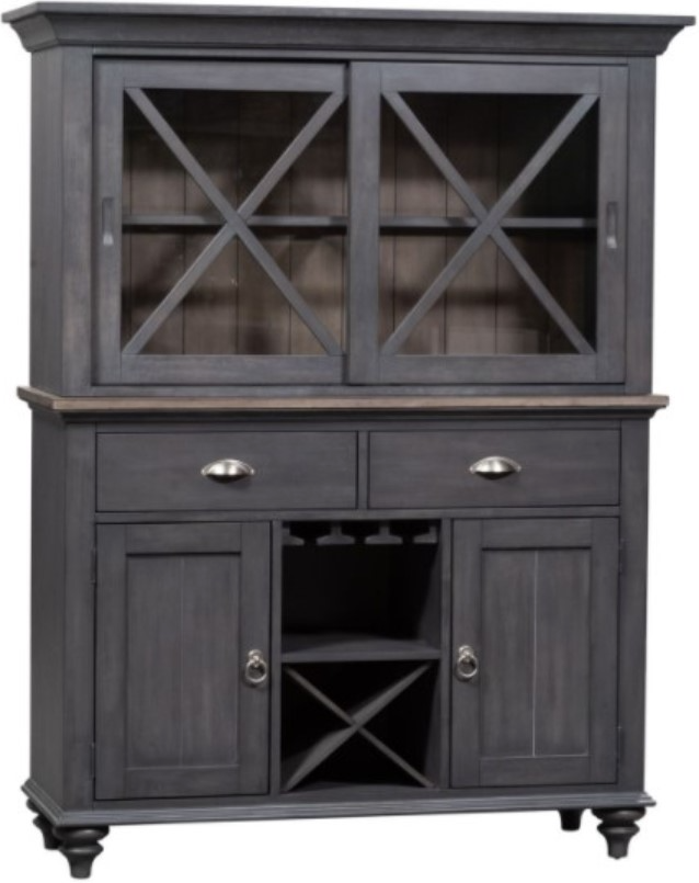Enhance your space with the Ocean Isle hutch and buffet. Crafted of rubberwood solids with pine veneers, this piece features a slate finish with weathered pine. Elegantly styled and casually proportioned, this server works in a dining room or kitchen dining combination effortlessly.Read More