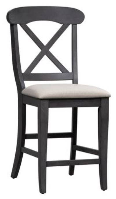 Sit in comfort and style with the Ocean Isle upholstered x back counter chair. Crafted of rubberwood solids, this piece features a slate finish, upholstery in grey linen, timeless napoleon styling, and is anchored by saber legs and nylon chair glides. This item comes in alternate finishes