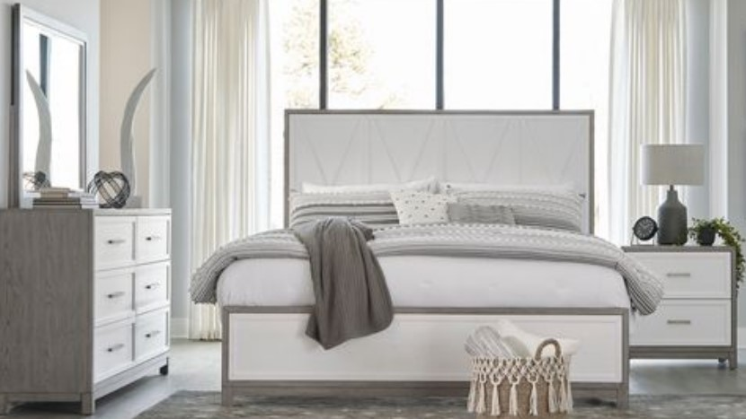 Home and perfection are achievable with the Palmetto Heights king panel bed, dresser, mirror, and nightstand. Crafted with excellence using rubberwood solids and split heart cathedral white oak veneers, this set has a two-tone Driftwood and Shell White finish.Read More
