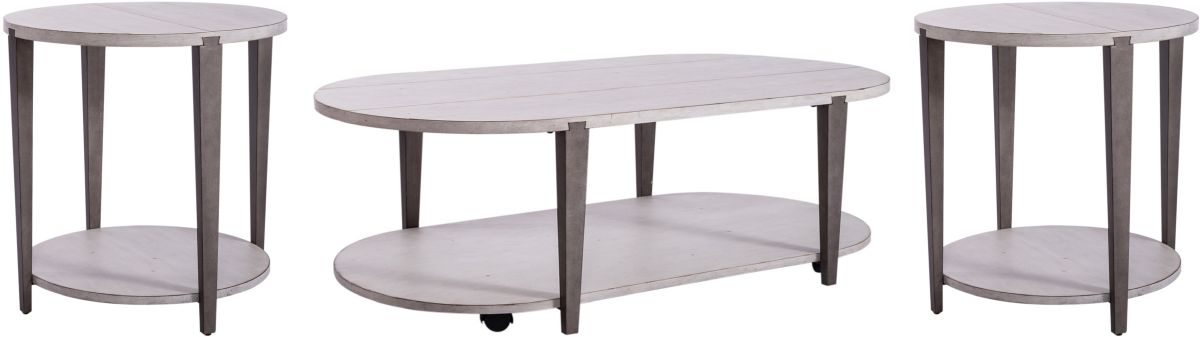 Accent your space with the three-piece Sterling occasional table set. Crafted of rubberwood solids and birch veneers, this kit is complete with one cocktail table and two end tables and has a weathered white finish. The cocktail and end tables have planked tops and open bottom shelves for storage, supported by tapered wood legs with a faux metal finish. The cocktail table also offers casters for easy mobility.Read More