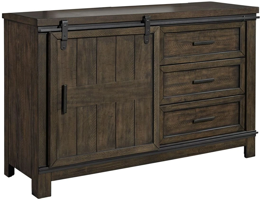 Add a natural feeling to your living space using the Thornwood Hills barn door dresser. Crafted by rubberwood solids and mango veneers, this piece features a rock beaten gray finish with saw cuts, planked tops and sides.Read More