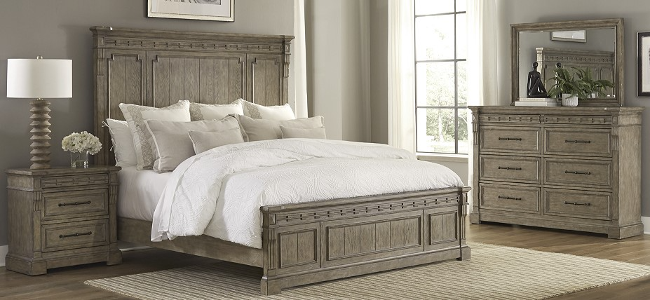 Set includes: King Bed, Dresser & Mirror, and Nightstand