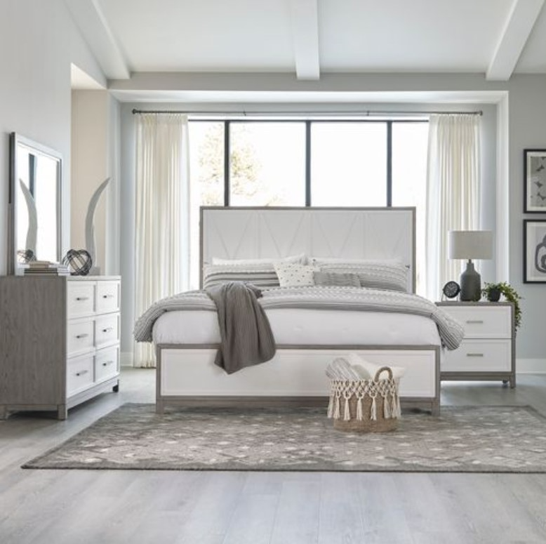 Home and perfection are achievable with the Palmetto Heights queen panel bed, dresser, mirror, and nightstand. Crafted with excellence using rubberwood solids and split heart cathedral white oak veneers, this set has a two-tone Driftwood and Shell White finish and features wood framed drawer fronts, full extension drawers that are accented with Pewter Wash bar pull hardware.Read More