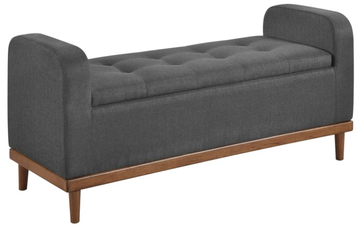 The dark gray textured fabric upholstery that covers the storage ottoman is perfectly complemented by the walnut finish of the solid wood support frame.