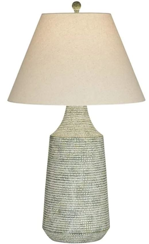 Sage green creates a soft, welcoming look and feel for a transitional farmhouse table lamp. Its dot texturing its rich and artistic, offering an artisan look and warm cream hue. This lamp is the perfect accent in a welcoming living room, delivering depth and texture to surrounding decor while providing inviting illumination.Read More