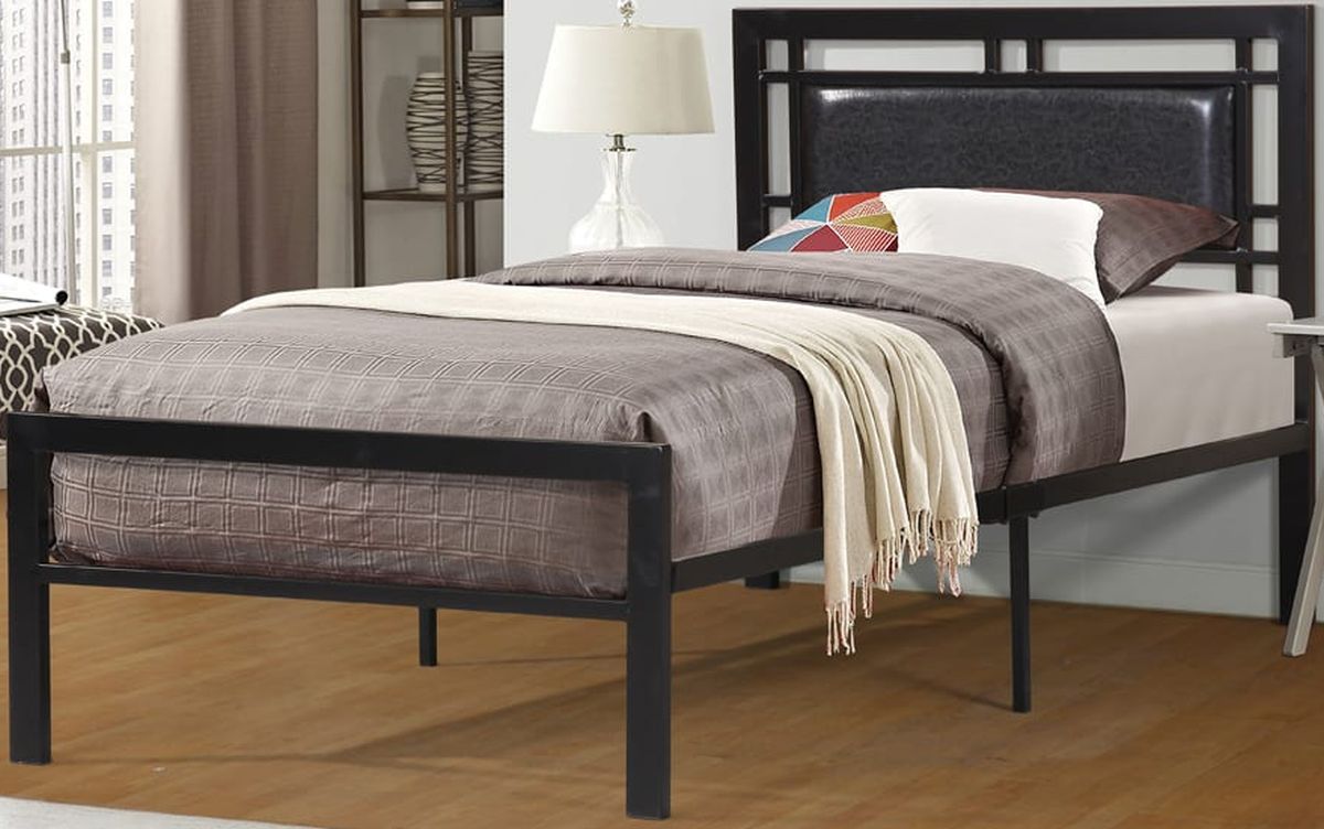 This simple, contemporary metal platform bed and leatherette headboard conveys chic style with its clean lines. The sturdy, steel-crafted frame promises stability and function. Ideal for space saving needs and complimentary to any wall colour, this bed is a perfect addition to the modern bedroom. Attractive white or black powder coated finish.Read More