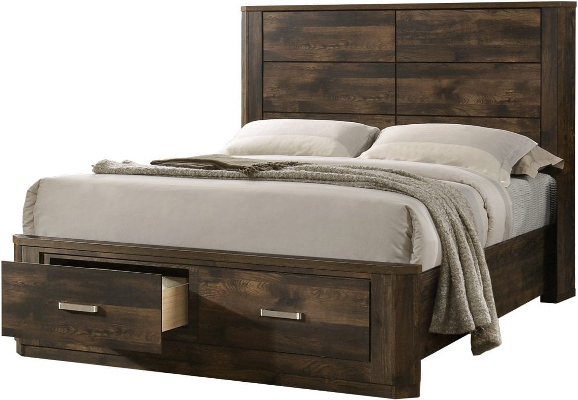 This deep walnut, distressed wood finish bedroom set, with contemporary hardware and lines will be sure to impress, while offering plenty of storage opportunities. Bed includes 2 front board storage drawers. All pieces include unique, beveled corners and chrome pulls.