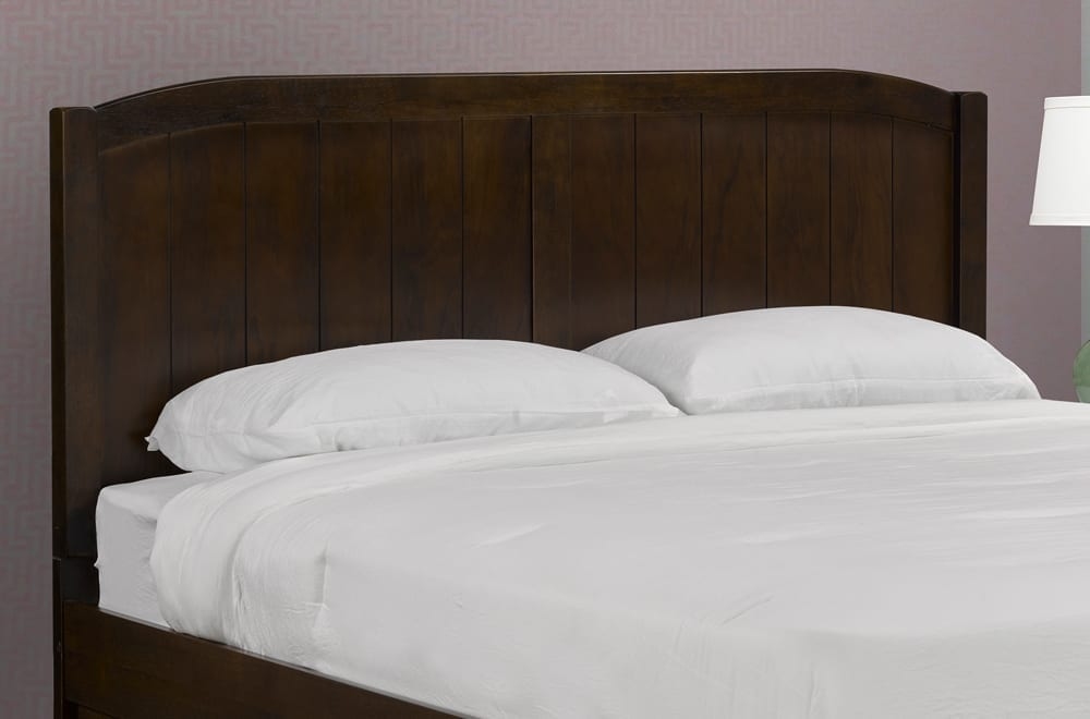 Clean lines and neutral colour ensure this headboard will fit within your bedroom design. With etched panels, a slight scalloped border and a dark walnut finish, you'll be sure to add a bit of sophistication to your bedroom. Headboard easily attaches to most beds.Read More