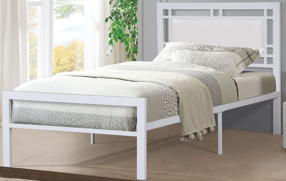 This simple, contemporary metal platform bed and leatherette headboard conveys chic style with its clean lines. The sturdy, steel-crafted frame promises stability and function. Ideal for space saving needs and complimentary to any wall colour, this bed is a perfect addition to the modern bedroom. Attractive white or black powder coated finish.Read More